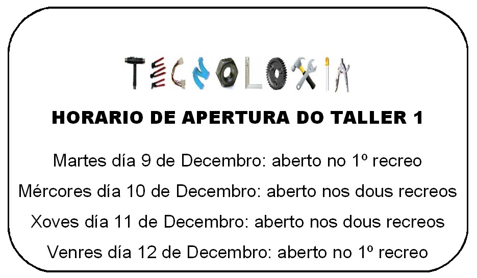 Apertura do taller durantes os recreos esta semana Mañán colgarei un igual na porta do taller 1. A ver se ao longo da semana podemos manter este horario. Compartir: Share on X (Se abre en una ventana nueva) X Compartir en Facebook (Se abre en una ventana nueva) Facebook Gústame Cargando... Relacionado Comentarios pechados