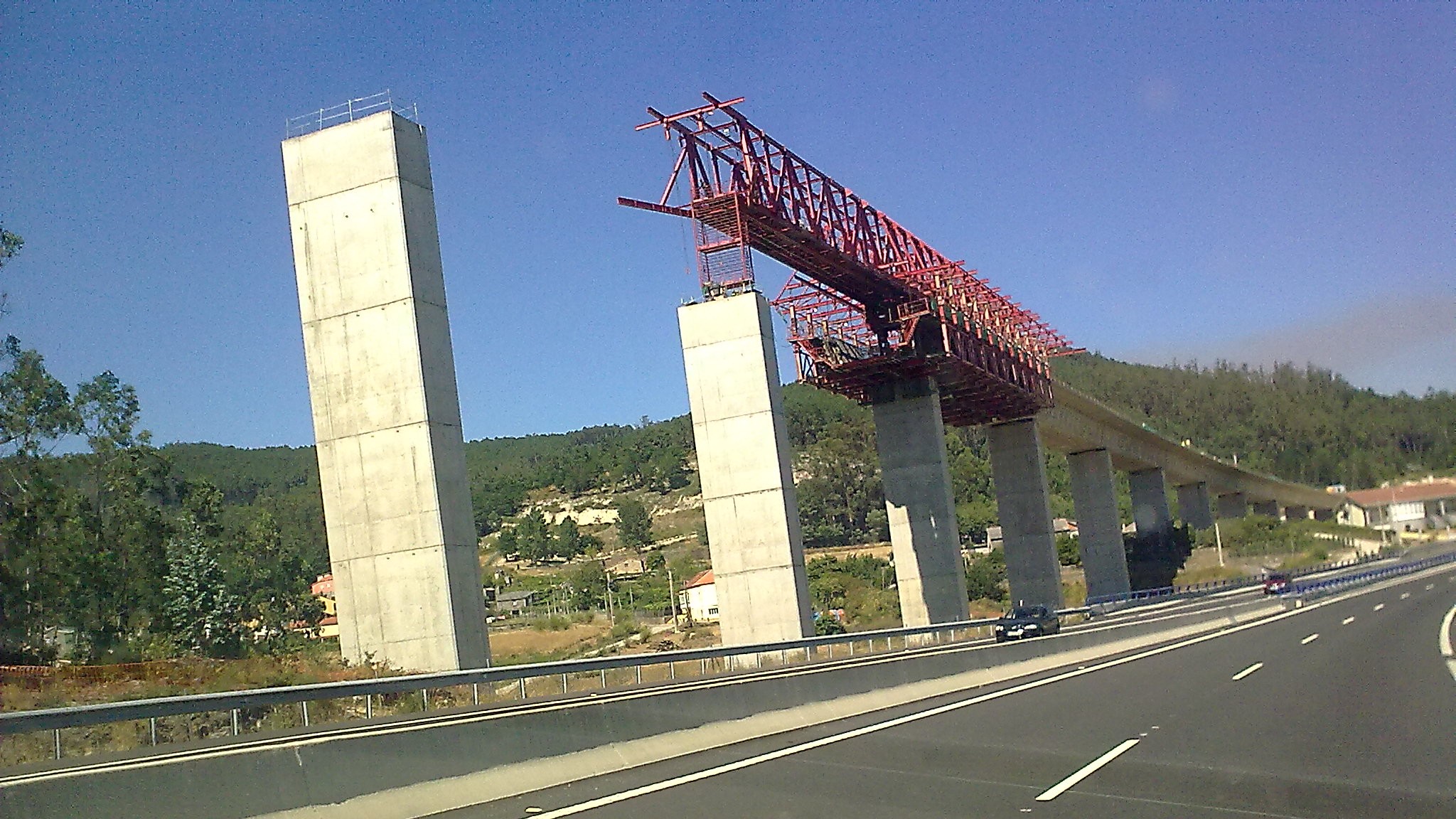 Si habéis entendido bien los conceptos, en la foto podéis ver un viaducto en construcción, con todas sus pilas y con varios tramos de tablero terminados. La estructura metálica que se intuye en la foto se denomina AUTOCIMBRA, y es la que hace de encofrado (molde) del tablero. En nuestro caso es una AUTOCIMBRA SUPERIOR, ya que está formada por una gran viga biapoyada que soporta el encofrado del tablero. Dicha viga se apoya en un tramo de tablero y en una pila. Una vez terminado el VANO (tramo de tablero entre dos pilas), se desplaza la AUTOCIMBRA a la siguiente posición con la ayuda de un mecanismo hidráulico. Dicha operación se repetirá tantas veces como vanos tenga el viaducto.