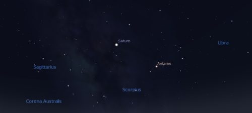 Na imaxe vemos Saturno e Escorpio. No corazón do escorpión destaca Antares, o rival de Marte (Ares). Esta superxigante vermella atópase a uns 550 anos luz, o que significa que a luz que nos chega dela comezou a súa viaxe aproximadamente a mediados do século XV.