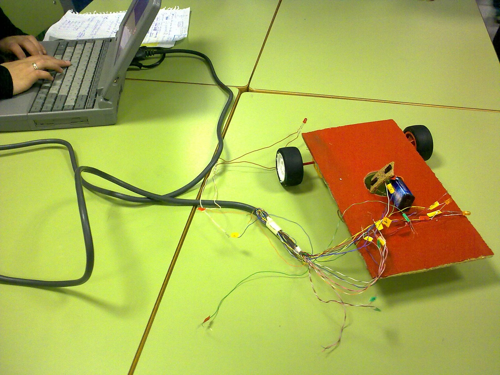 - O equipo formado por Adrián, Ismael, Sandra, Raquel, Héctor e Álvaro decidiu construír un autobús. O deseño incorpora dous motores, dous intermitentes, dúas luces de posición e dúas luces de freo. O programa realizado en MSWLogo permite activar e desactivar os motores de forma independente, de maneira que o autobús pode avanzar e xirar a esquerda e dereita, poñendo en funcionamento o intermitente que corresponda. Cando o autobús está parado, as luces de freo acéndense e en calquer momento podemos acender ou apagar as luces de posición. O equipo de conexión rematou onte o circuíto dos motores e fixeron con éxito a primeira proba de control dos dispositivos. Aquí tedes unhas fotos deste proxecto: